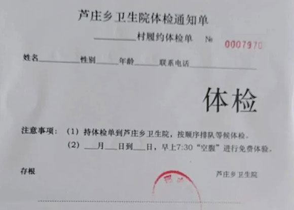 為了讓更多的村民參與體檢,在體檢活動(dòng)開始前,村衛(wèi)生室的鄉(xiāng)村醫(yī)生通過(guò)上門入戶發(fā)放體檢通知單的方式通知到所在村村民。下圖為體檢通知單: